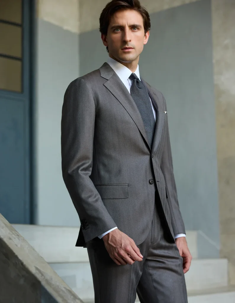 セットアップスーツにオーダーメイドのTシャツを合わせるスタイルは、エフォートレスで現代的なビジネススタイルです。